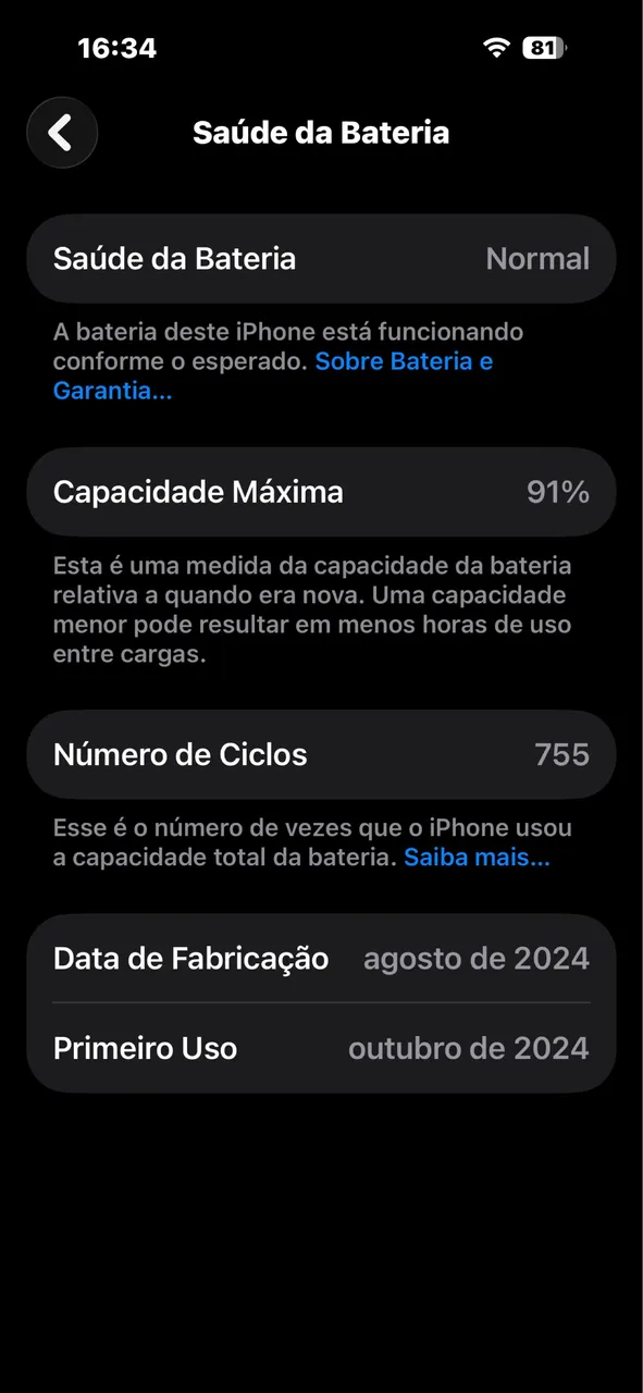 Saúde da bateriaPerfeita (95% Até 100%)