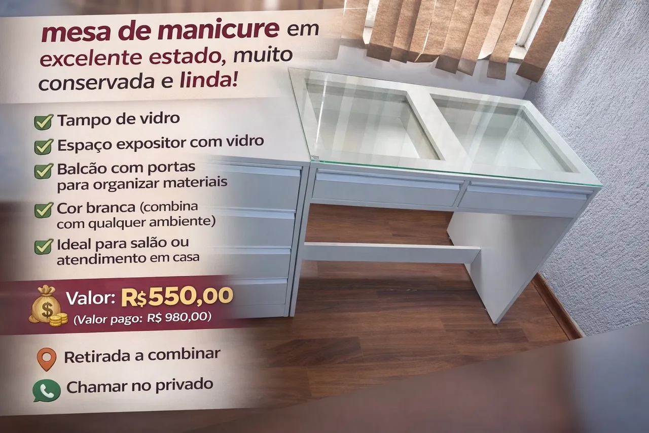Linda mesa de manicure em excelente estado, com tampo de vidro e espaço expositor. Perfeita para salão ou atendimento em casa. Cor branca que combina com qualquer ambiente. Aproveite!