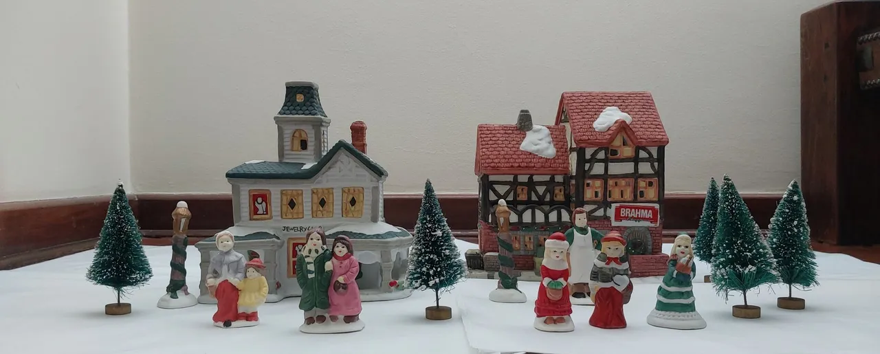 Encante sua decoração natalina com esta charmosa vila em miniatura de porcelana chinesa de meados dos anos 80. Detalhes ricos e cores vibrantes, perfeitamente preservados, inclusive fiação elétrica, lâmpadas originais, manual e caixa. Inclui ainda mais 8 enfeites para árvore também em porcelana e riquíssimos detalhes.