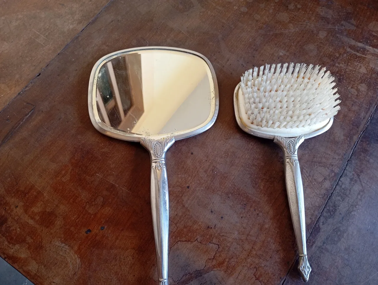 Lindo conjunto vintage para penteadeira, com espelho e pincel de cabelo. Perfeito para um toque de elegância e charme retrô.