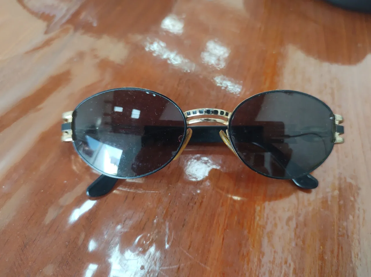 Óculos de sol vintage com armação dourada e lentes escuras. Ótimo estado de conservação, ideal para quem busca um acessório clássico e elegante.
