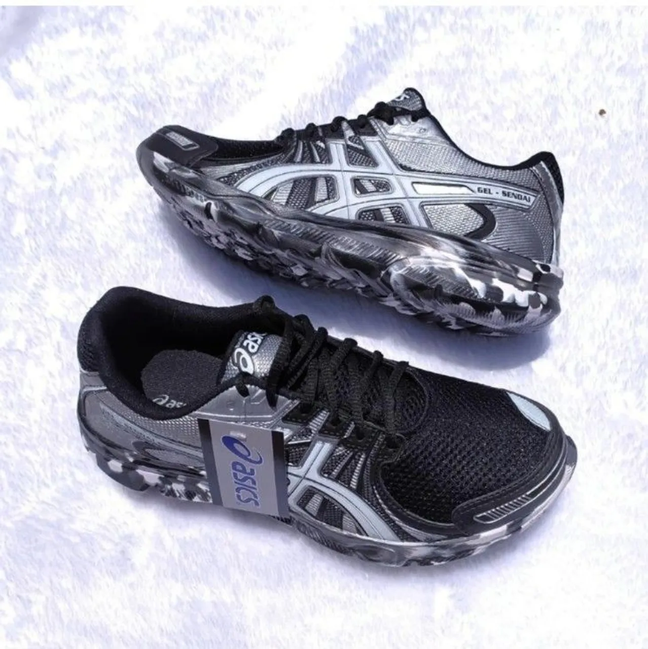 Tênis Asics Gel-Sendai em preto com detalhes em prata. Design moderno e confortável para suas atividades.