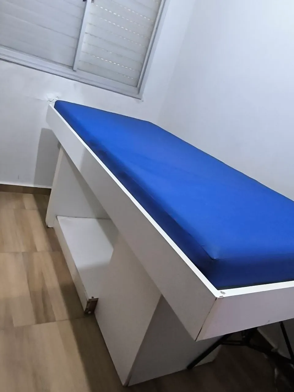 Maca feita por marceneiro , ótimo material , suporta mais de 150 kg , na cor branca com colchão estofado azul. , higiênico , tipo hospitalar iIdeal para consultórios e clínicas. Design moderno e funcional. Pode ser usado para massagem , depilação ,cílios , excelente oportunidade,