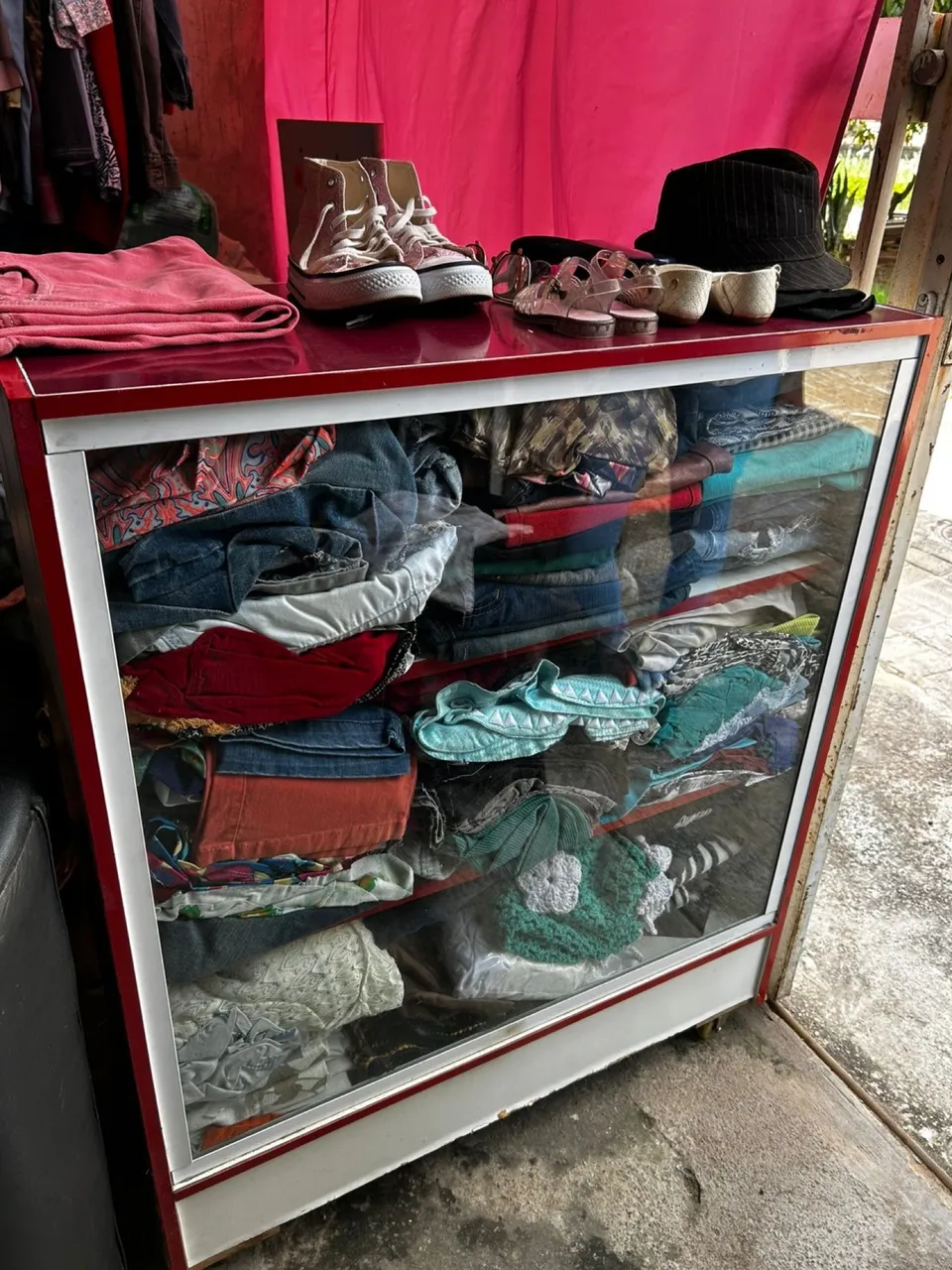 Balcão com frente de vidro ideal para expor seus produtos de forma organizada e elegante. Perfeito para lojas, feiras e eventos.