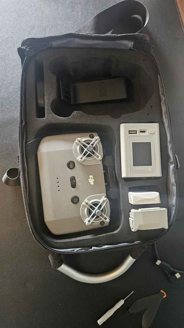 Kit Dji mini 4 Pro: -Bolsa -Controle RC-N2 -Adaptador para Tablet -Cabo usbc -Protetor Gimbal -1 Bateria original -Carregador Duplo -Ferramenta e Hélices Motivo: Meu drone sofreu queda, estou vendendo os acessórios.