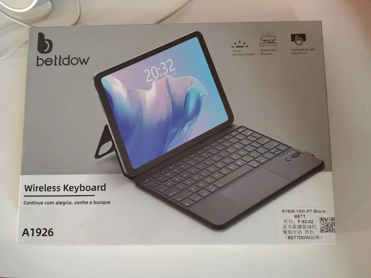 Teclado Wireless Bettdow A1926 com design elegante e teclas retroiluminadas. Perfeito para quem busca praticidade e conforto para trabalhar ou estudar. Possui trackpad de alta frequência e botões tipo tesoura.