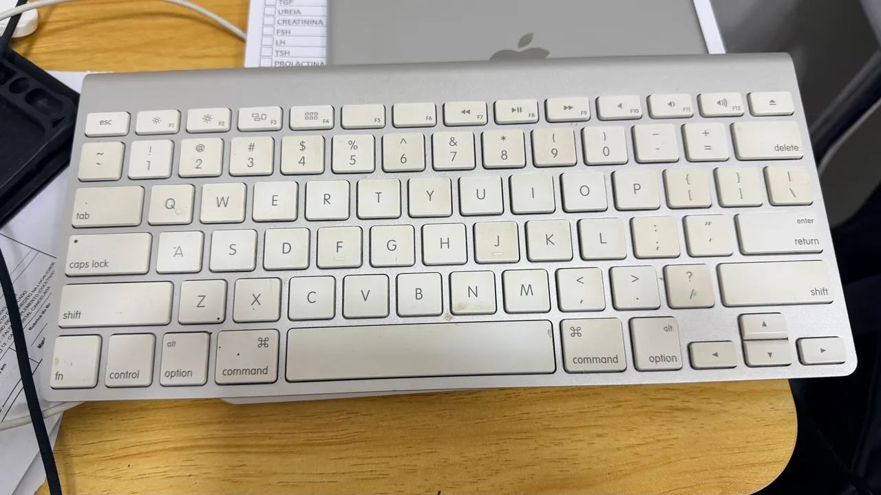 Teclado Apple Bluetooth 2009, design elegante e funcionalidade sem fio. Perfeito para quem busca praticidade e estilo em um só produto. Conecte-se facilmente e desfrute de uma experiência de digitação suave e confortável. Requer duas pilhas AA para funcionamento.