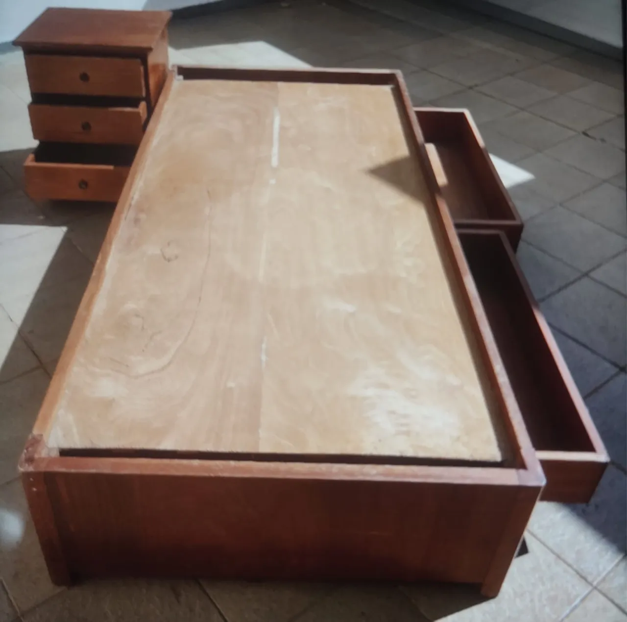 Cama de solteiro em madeira maciça com dois gavetões embutidos.