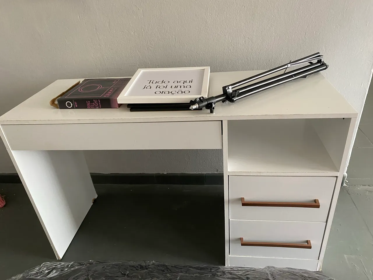 Escrivaninha branca ideal para estudos ou trabalho, com gavetas espaçosas para organização.