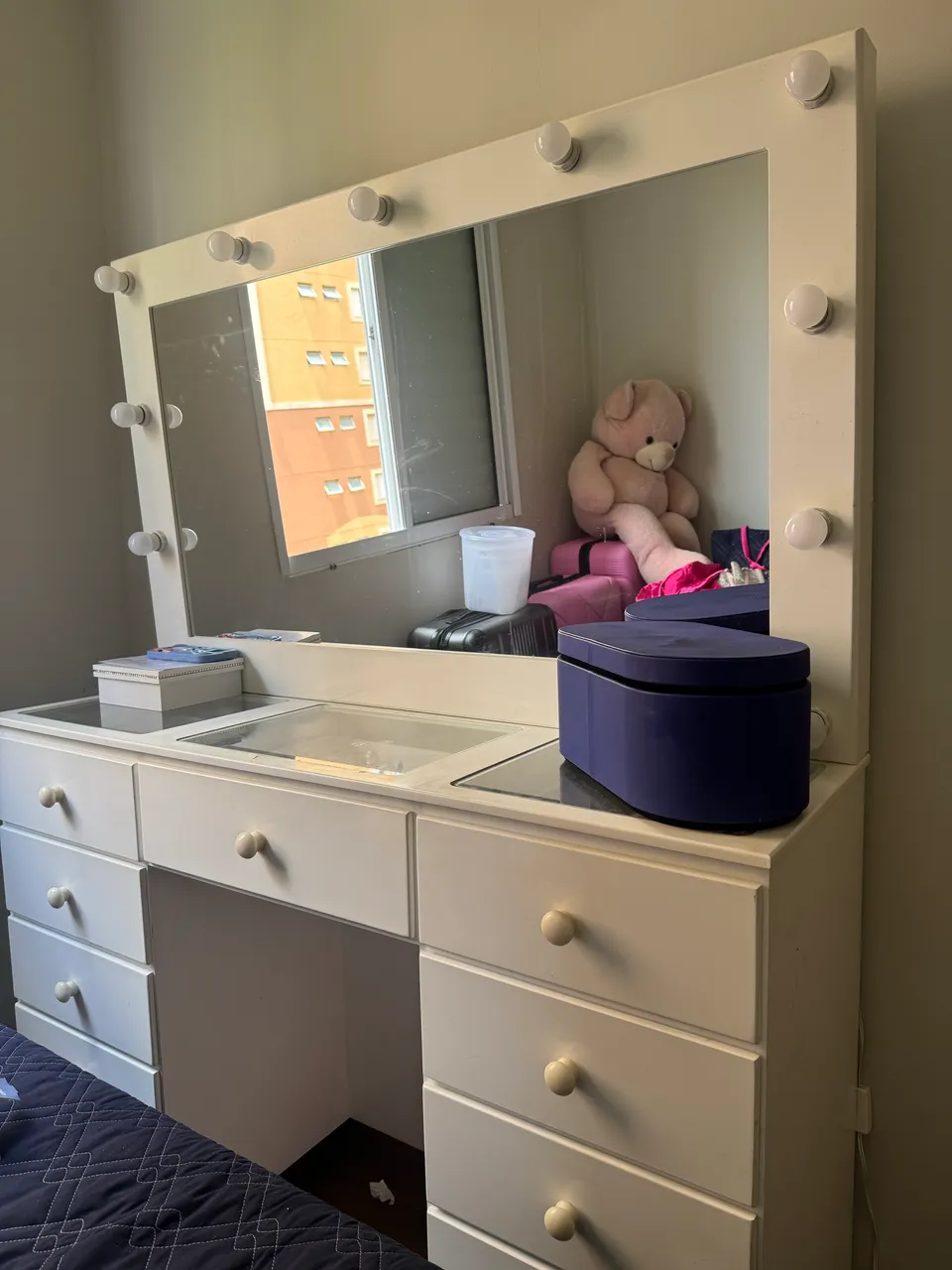 Linda penteadeira camarim com espelho e iluminação embutida! Ideal para organizar seus produtos de beleza e criar um espaço charmoso e funcional. Perfeita para quem busca praticidade e elegância.