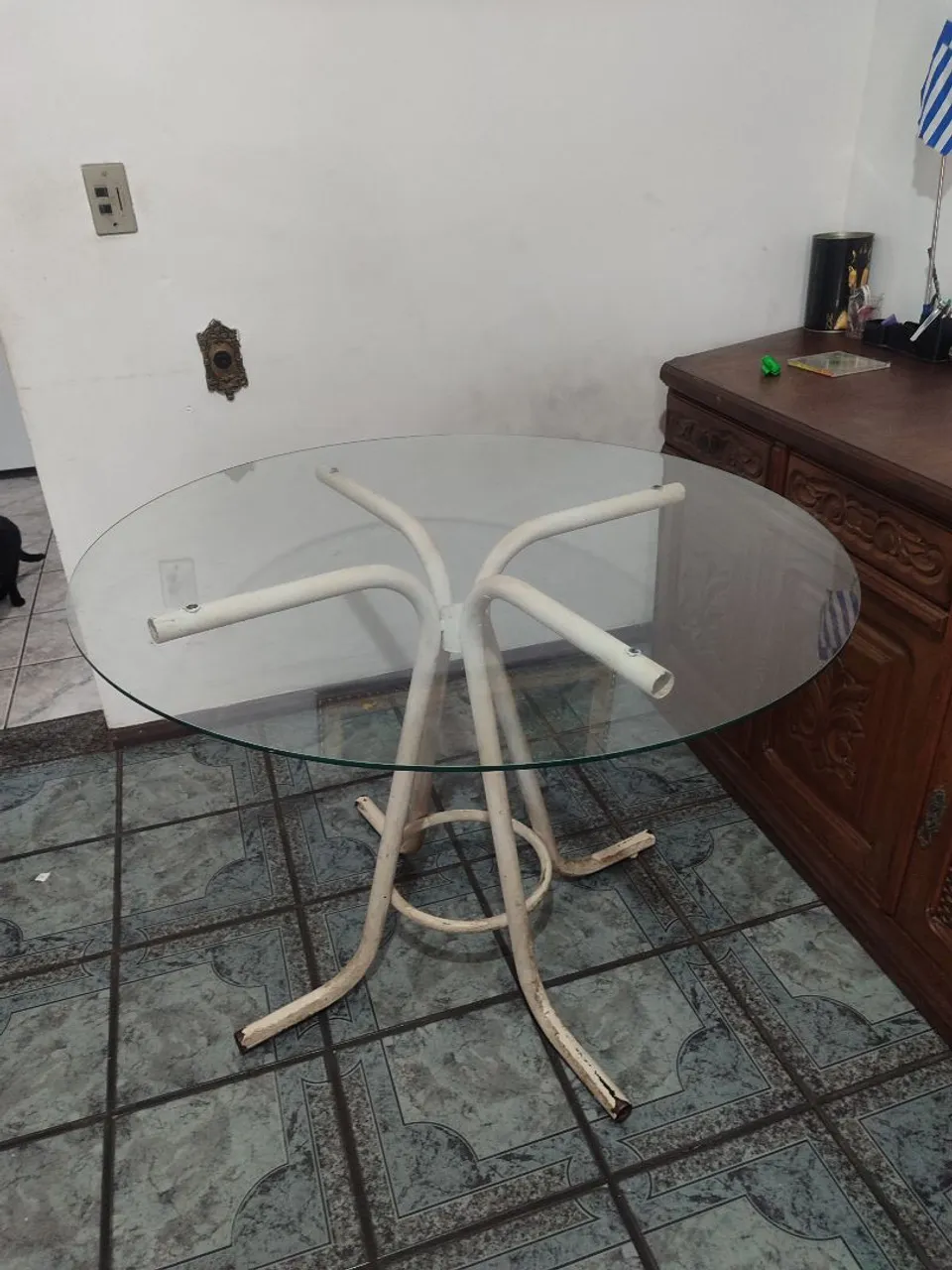 Mesa com tampo de vidro redondo, para sua sala de jantar ou cozinha. O tampo de vidro não tem nenhuma rachadura, os pés para ficar bacana seria legal pintar com spray preto ou outra cor de sua preferência