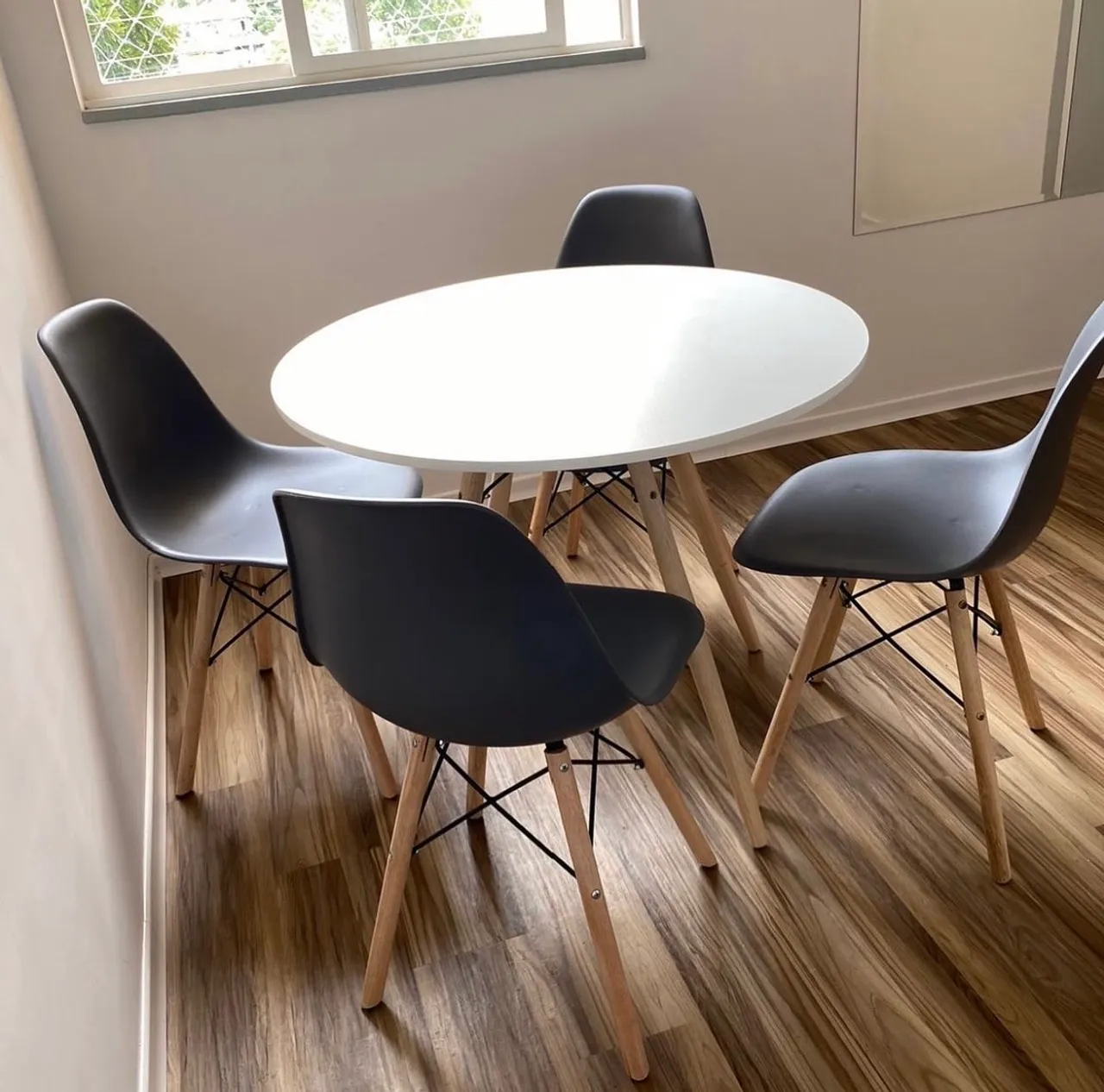 Conjunto de mesa redonda branca com 4 cadeiras pretas no estilo Eiffel, perfeito para sua sala de jantar ou cozinha. Design moderno e elegante para qualquer ambiente!