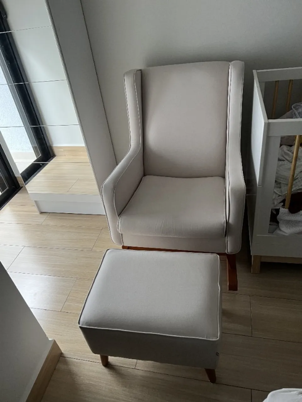 Poltrona em madeira maciça, com apoio para os pés e balanço.
