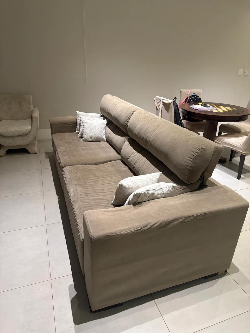 Sofá espaçoso de 4 lugares em tecido suede marrom, perfeito para sua sala de estar. Acompanha 5 almofadas para um conforto extra e um toque de elegância.