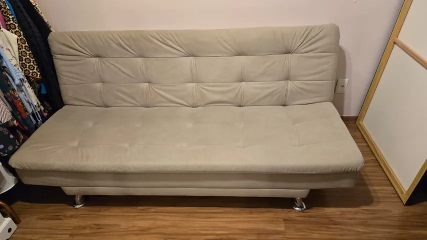 Sofá cama bege em tecido suede, perfeito para otimizar seu espaço com conforto e elegância. Design moderno e funcional, ideal para relaxar e receber visitas.