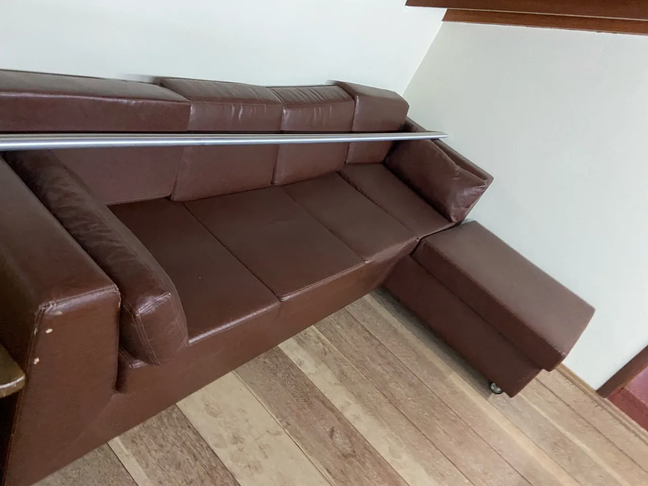 Sofá de canto em couro marrom, confortável e elegante. Perfeito para sua sala de estar! Possui assentos acolchoados e encosto alto para maior conforto. Ideal para relaxar e receber amigos e familiares.