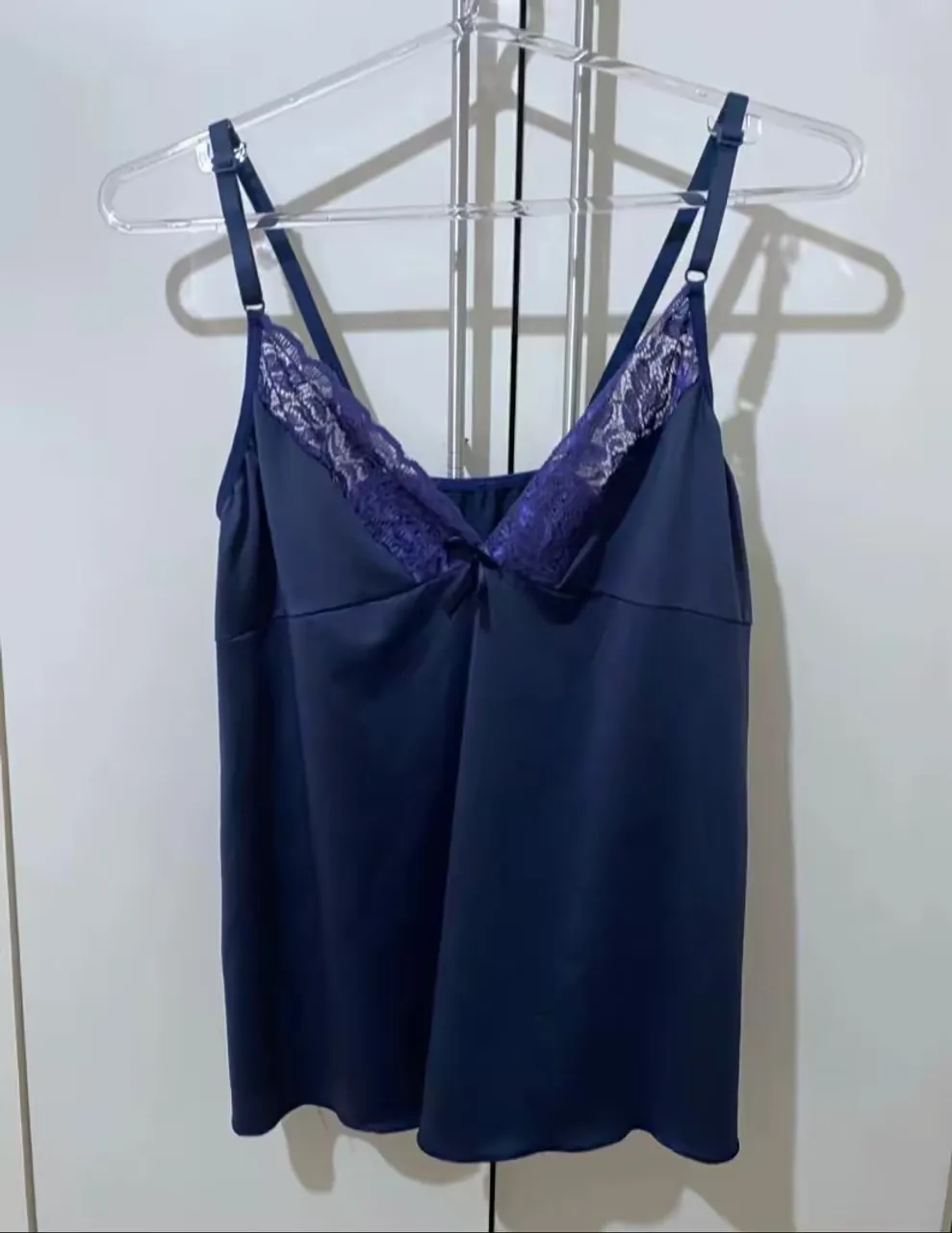 Charmosa regata azul marinho, ideal para noites tranquilas e confortáveis. Detalhes em renda que adicionam um toque de elegância e delicadeza à peça.