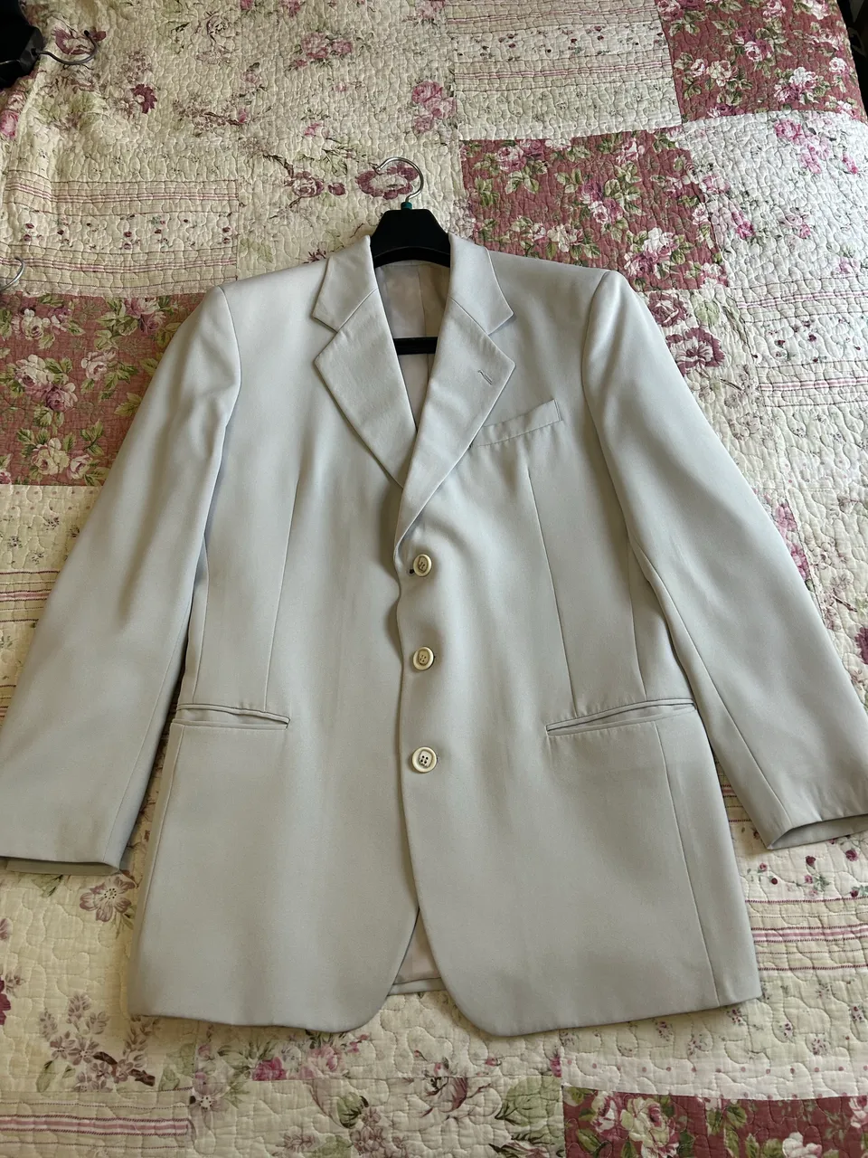 Terno cru, da marca TNG. Paletó: Tamanho 46. Possui ombreiras. Calça: Tamanho 48.