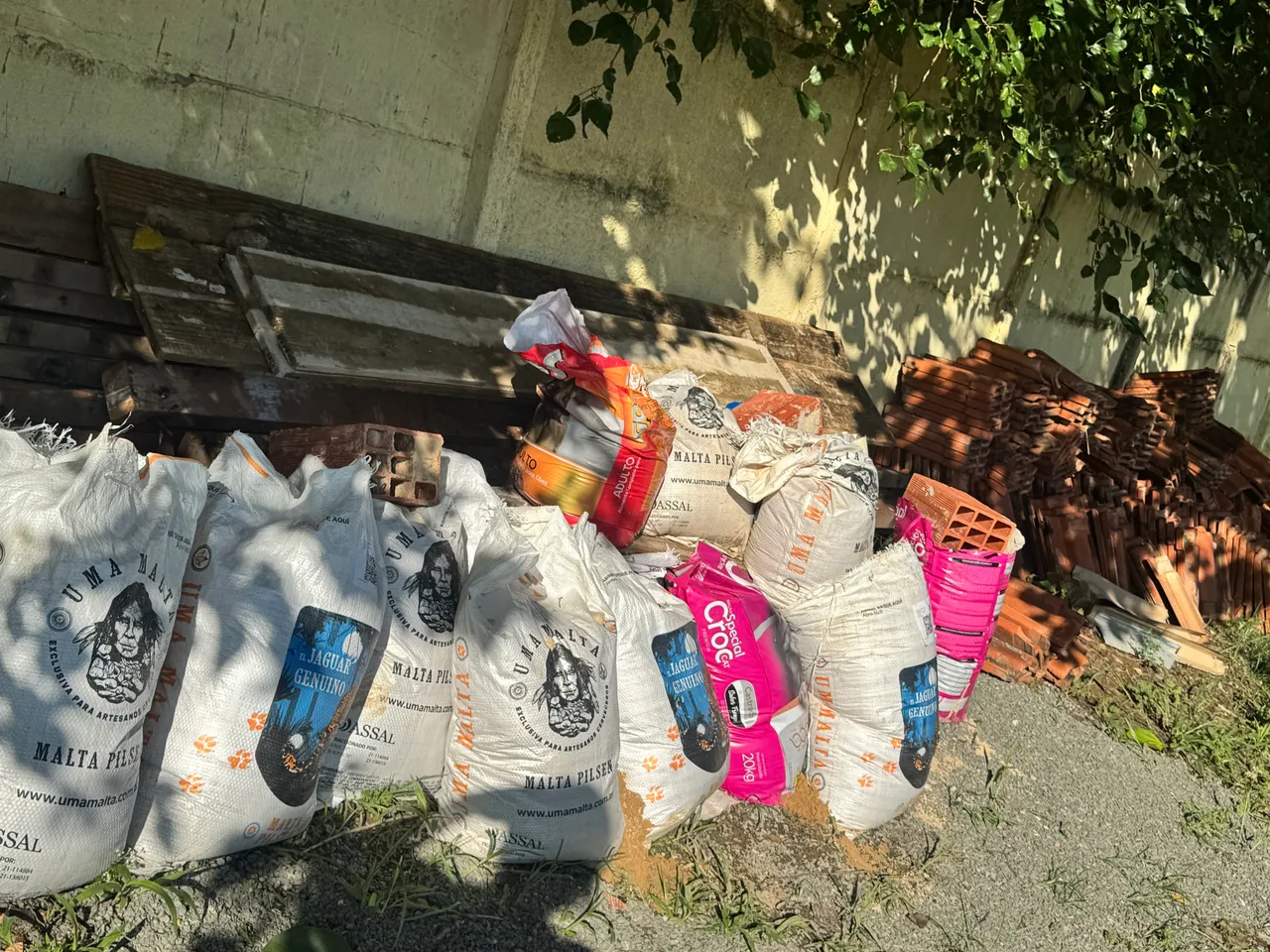 Vendo aproximadamente 150 telhas, 17 vigas (16 com 10 cm de espessura e 1 com 15 cm de espessura), com comprimentos variados entre 2,5 m e 5 m. Também vendo 15 sacos de areia e 5 meio-sacos de brita.
