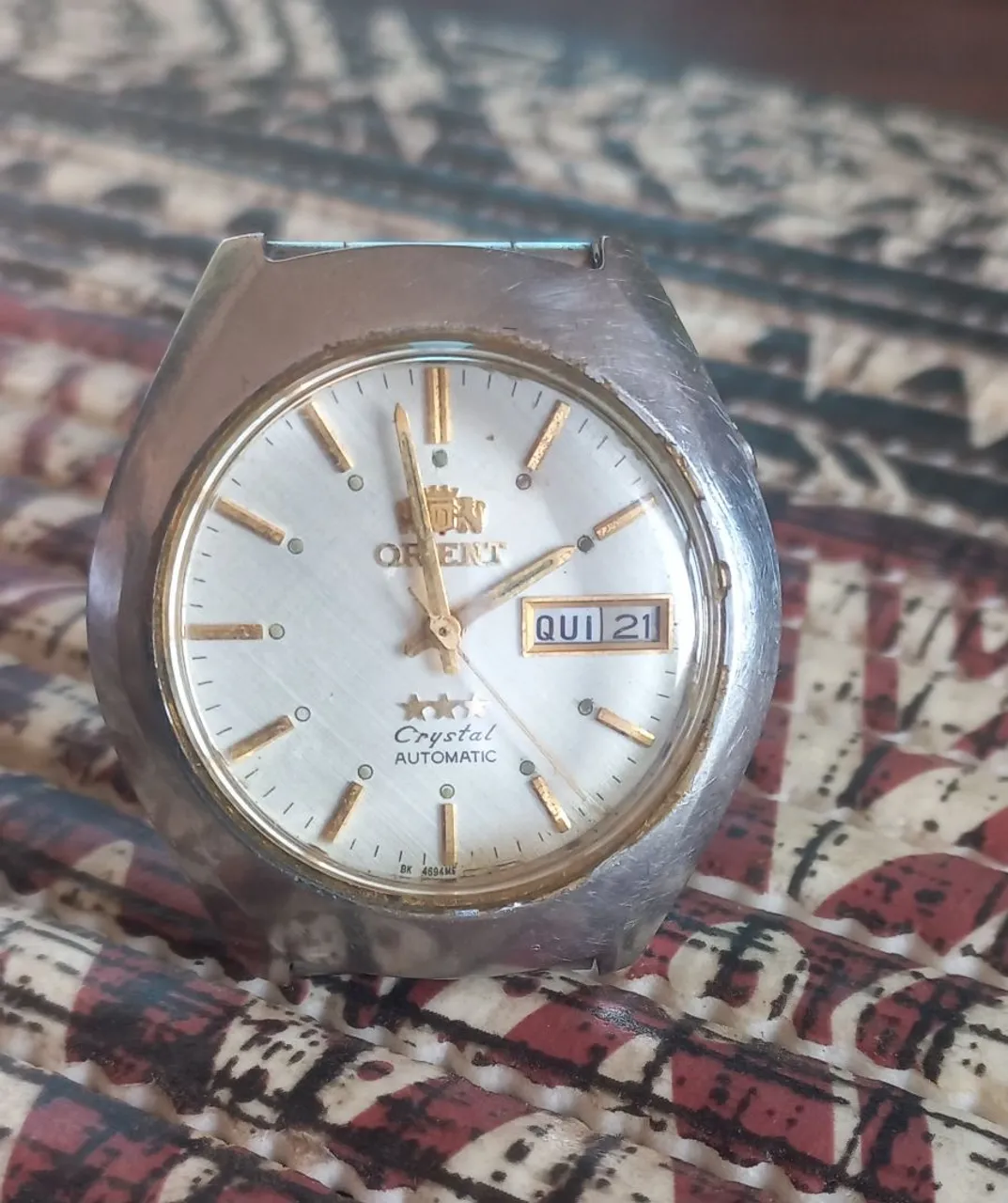Relogio Orient automático 3 estrelas Crystal, fundo branco e marcadores prata, funcionando normal hora e data, revisado, sem garantia, com marcas de uso.envio por conta do comprador, faço por olx Chamar no WhatsApp 14 ... ver número