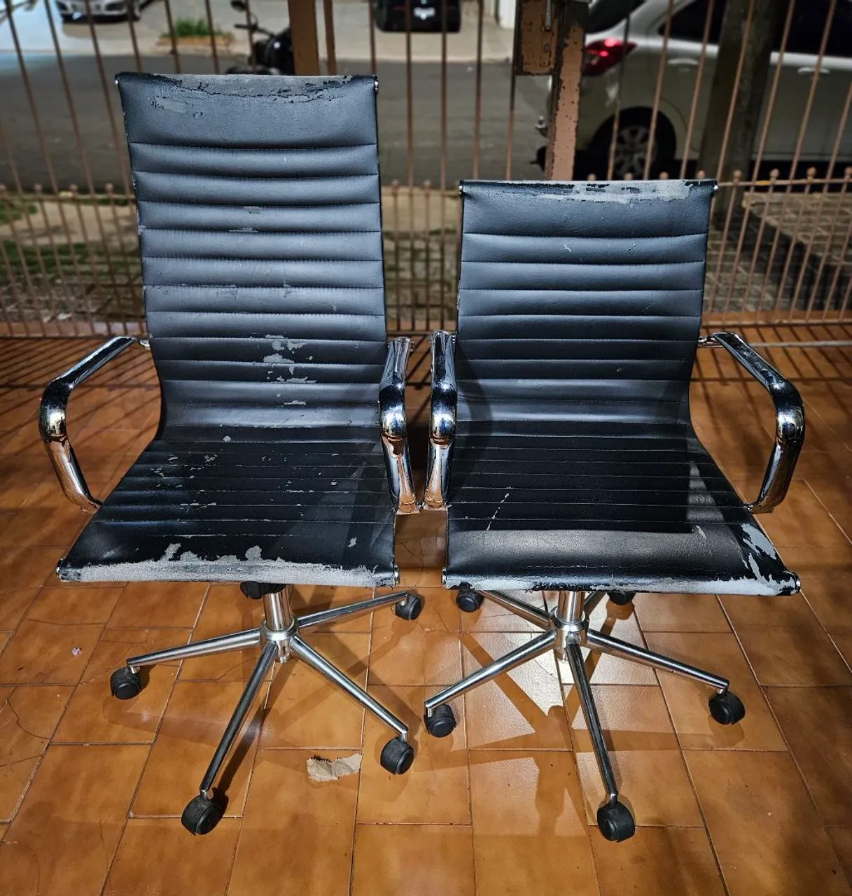 Duas cadeiras de escritório executivas, com estrutura em aço cromado e revestimento em couro sintético. Ideais para escritórios, consultórios e outros ambientes corporativos. Em ótimo estado de conservação.