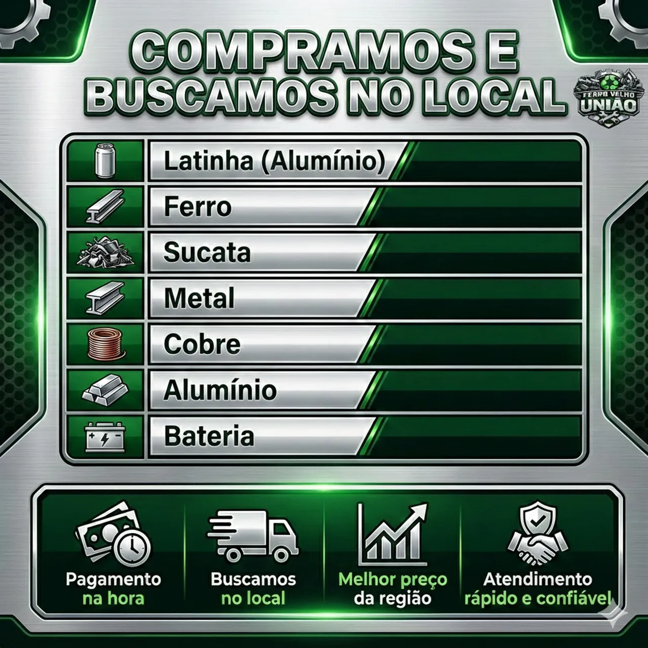 ? FERRO VELHO UNIÃO ? Compramos e buscamos no local! ? Latinha (alumínio) ? Ferro ? Sucata ? Cobre ? Alumínio ? Baterias ? Pagamento na hora ? Buscamos no local ? Melhor preço da região ? Marília - SP ? Chama no WhatsApp e faça seu orçamento!