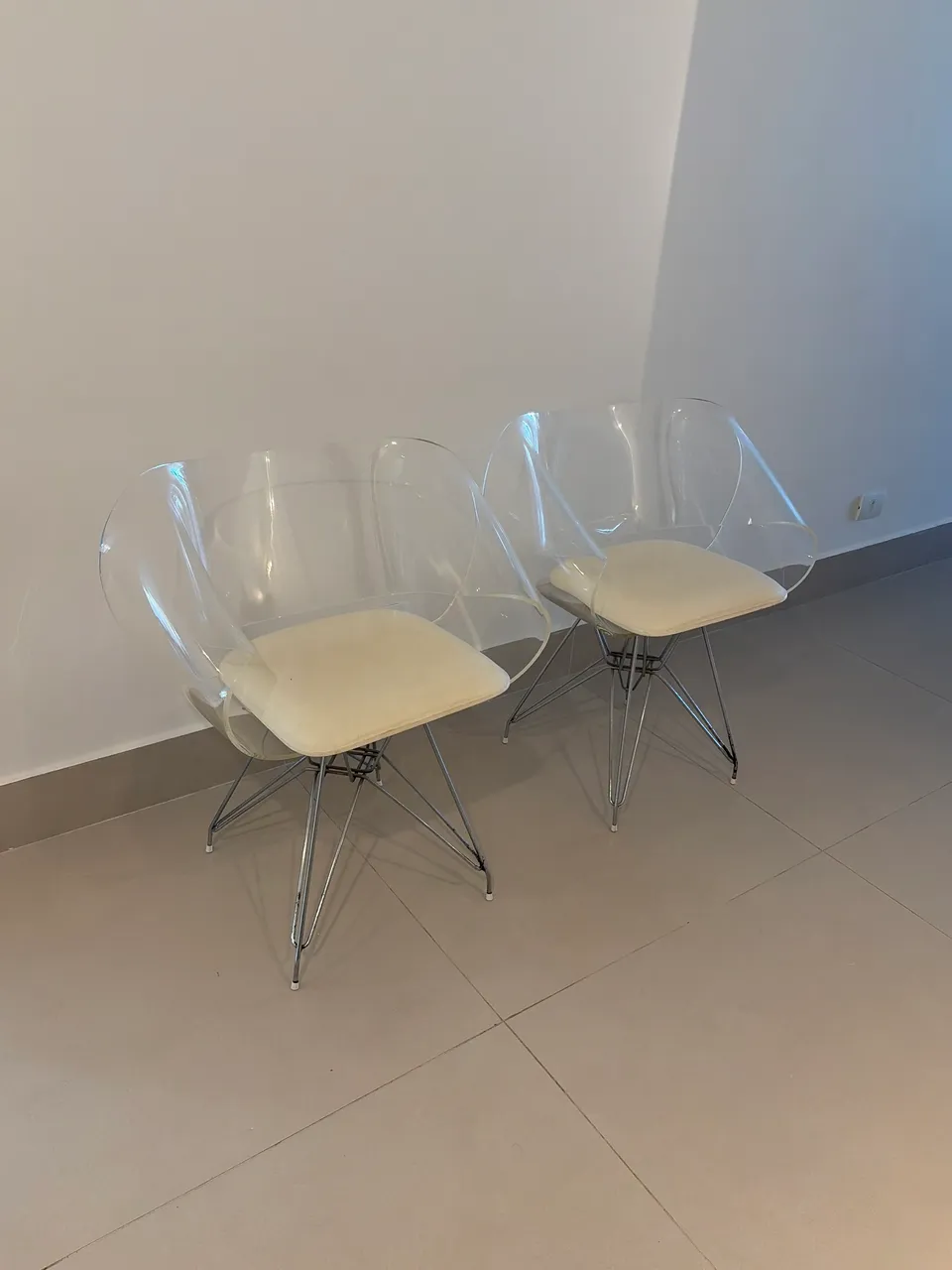 Par de cadeiras em acrílico transparente, com design contemporâneo e elegante.