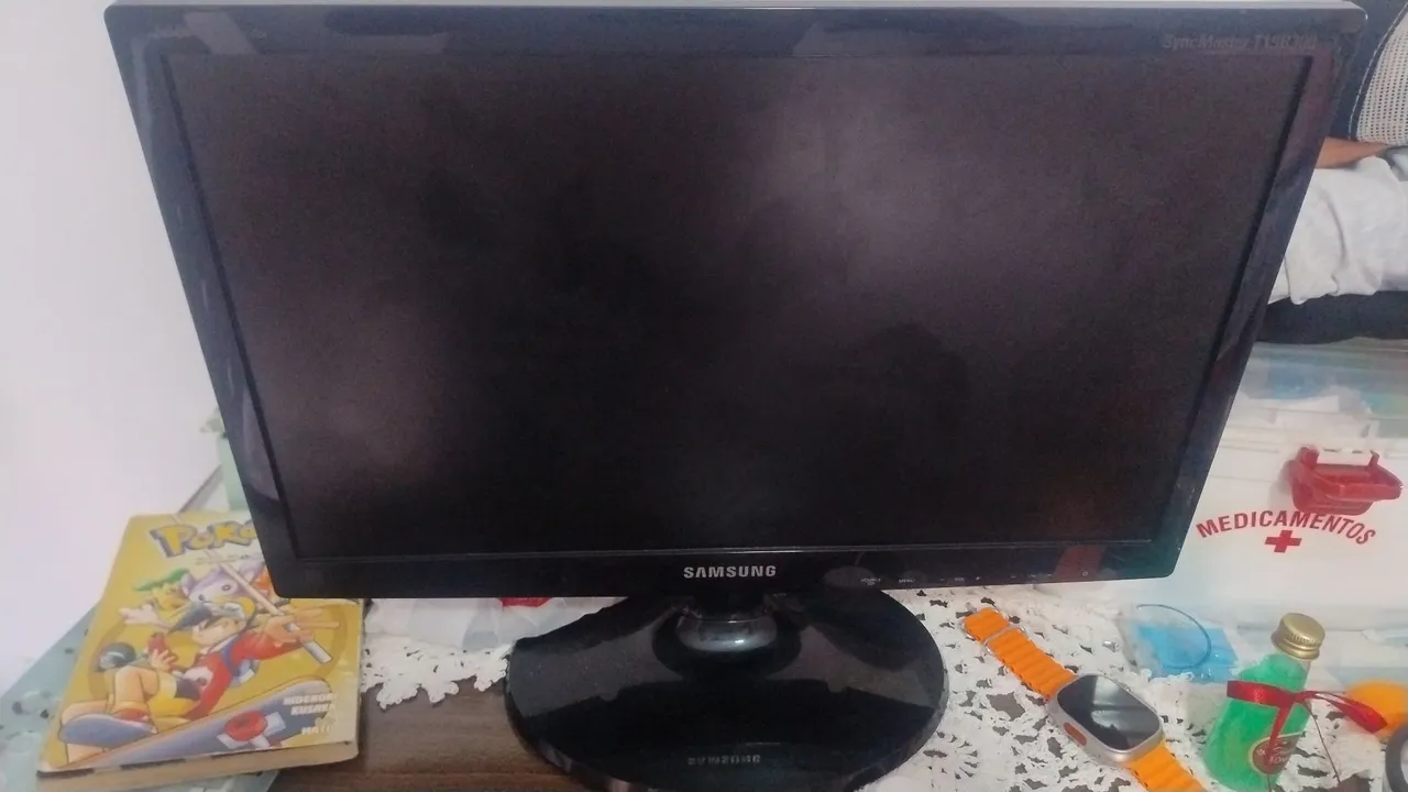 TV LCD Samsung de 19 polegadas, ideal para quem busca peças ou para conserto. Design compacto e perfeito para diversos ambientes.