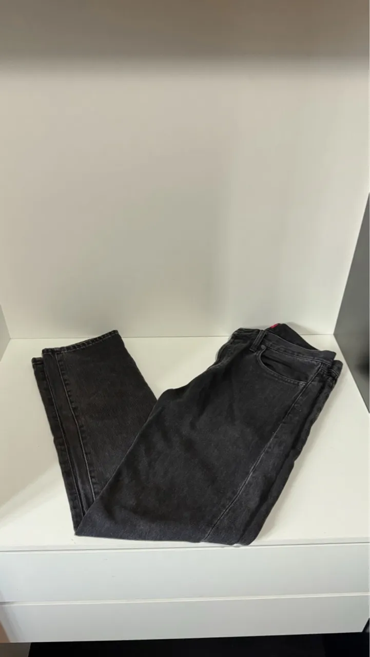 Calça jeans preta clássica, perfeita para diversas ocasiões. Conforto e estilo em uma peça única.