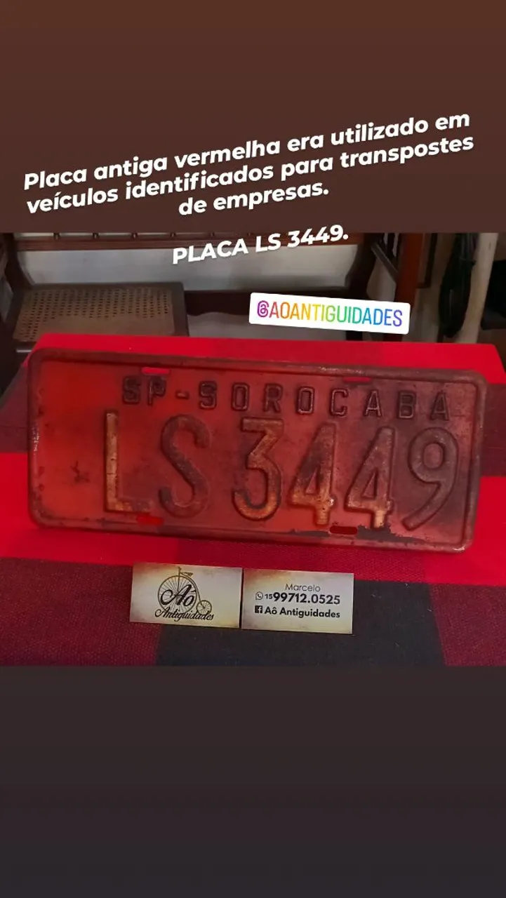 Placa antiga, para decoração. Placa antiga vermelha era utilizado em veículos identificados para transpostes de empresas. PLACA LS 3449. Aô Antiguidades Sorocaba SP Whatsapp