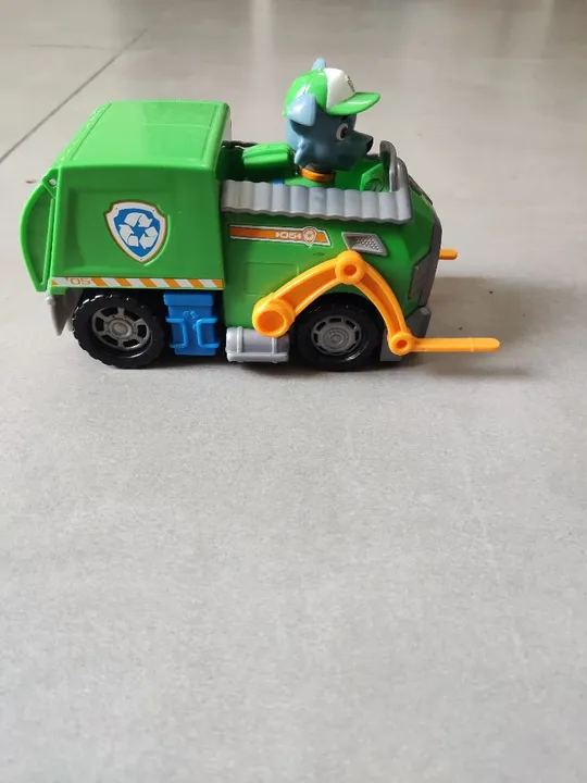 Rocky da Patrulha Canina. O caminhão é verde e tem detalhes em laranja. O Rocky está no volante e o caminhão tem um compartimento. Perfeito para brincar de faz de conta!