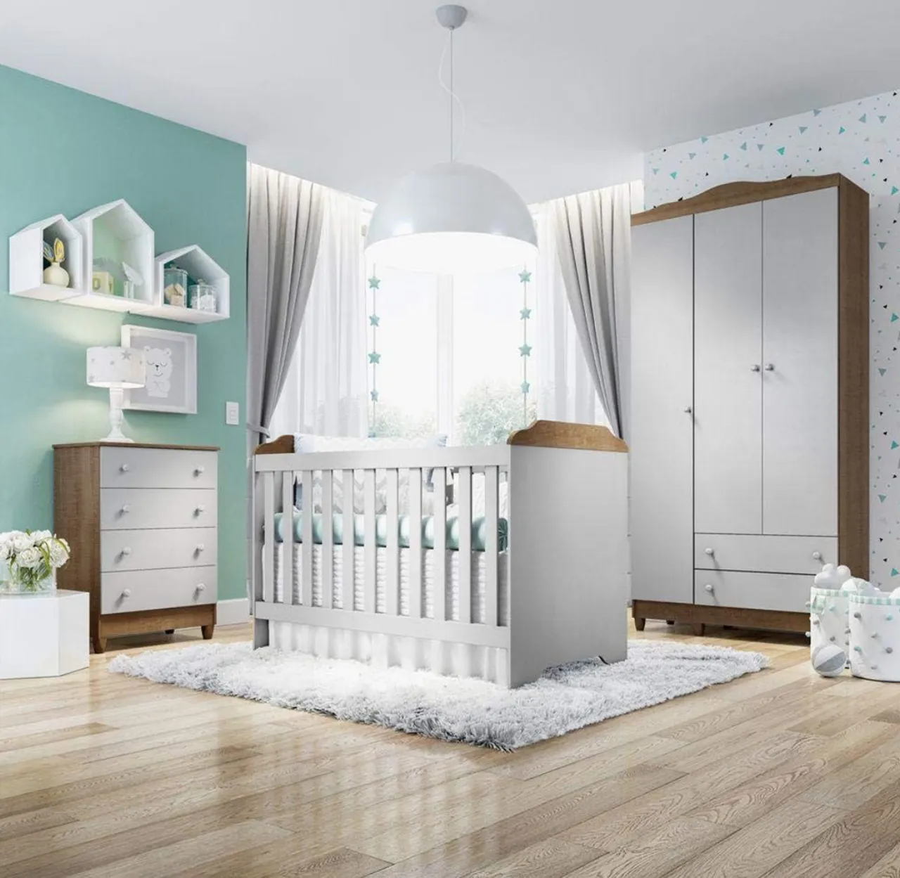 Design moderno e funcional, com berço, guarda-roupa e cômoda. Conforto e estilo para o quartinho do seu filho!