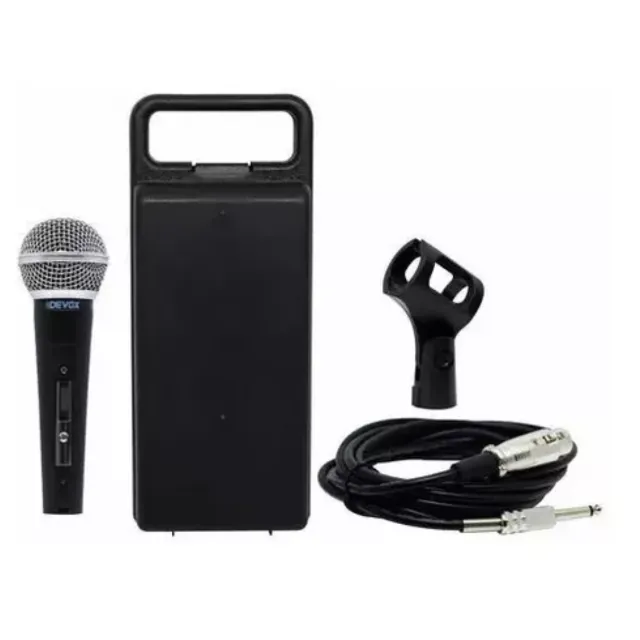 Microfone Devox com fio, maleta e cachimbo.