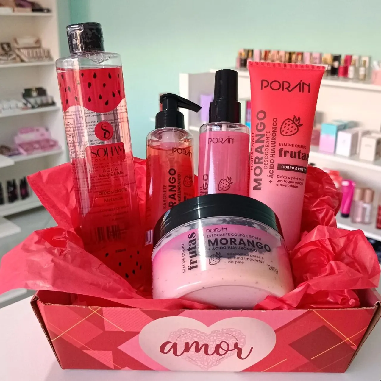 Surpreenda quem você ama com a Cesta Amor! Este presente especial contém produtos de beleza com aroma de morango, incluindo hidratante, esfoliante e outros mimos para cuidados com a pele. Perfeito para demonstrar carinho e celebrar o amor!