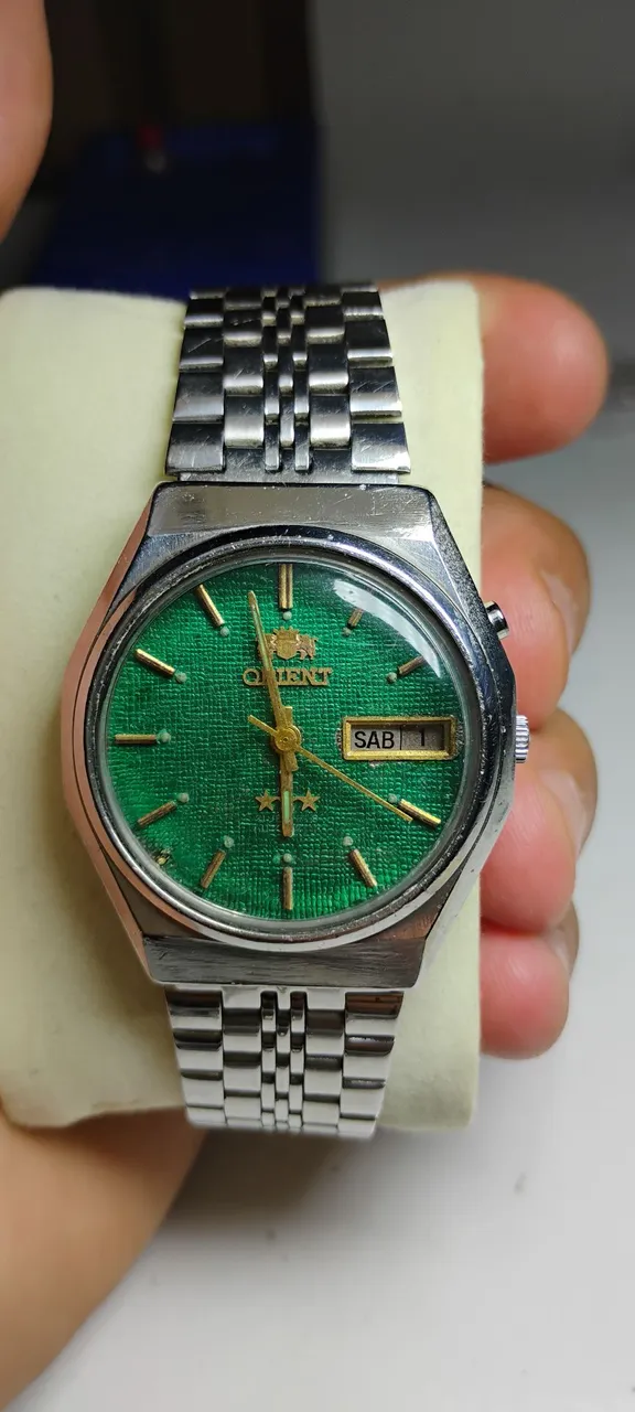Relógio Orient 3 Estrelas Automático com mostrador verde vibrante. Um clássico que combina elegância, relógio revisado há poucos dias, funcionando perfeitamente, hora e data