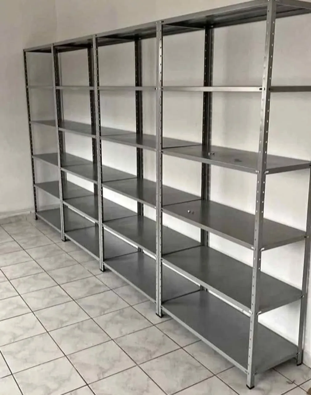 Prateleiras de aço resistentes e ideais para organização e exposição de produtos em comércios e lojas. Ótima capacidade de armazenamento.