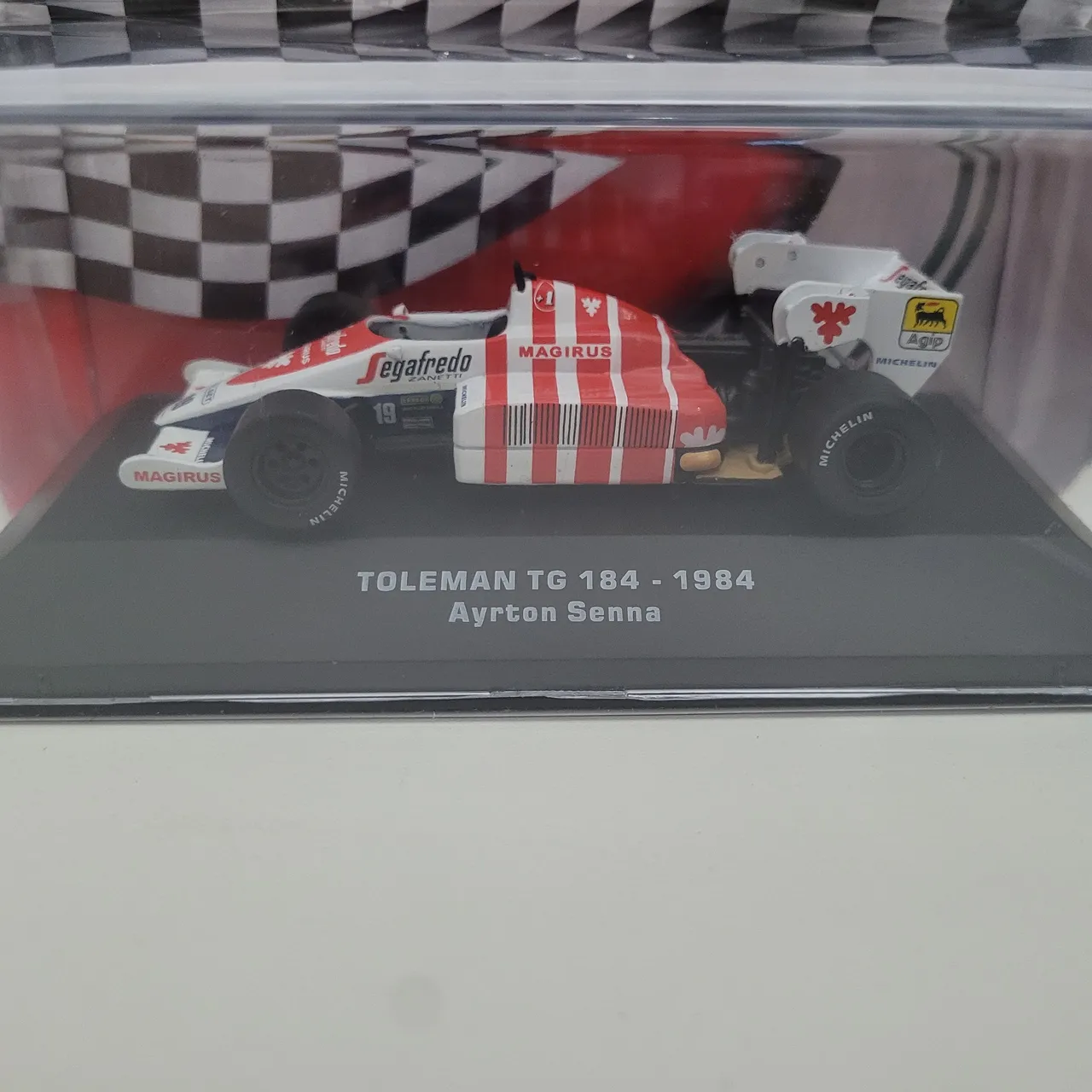 Linda miniatura do carro de Fórmula 1 Toleman TG 184 pilotado por Ayrton Senna em 1984.