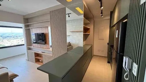 O imóvel está pronto para morar: conta com cama, sofá, TV e ar-condicionado, além de uma cozinha completa com armários planejados, geladeira, micro-ondas, cooktop e bancada de madeira com duas banquetas.