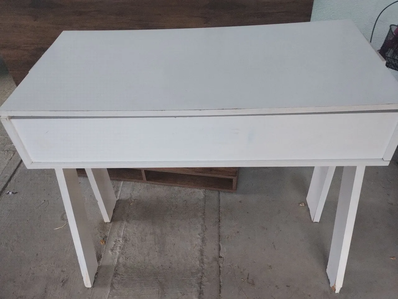 Meaa que pode ser usada como escrivaninha e penteadeira, com espelho, divisórias internas espaçosas, a madeira da frente tem um dos lados rosa, tendo a opção de ficar com a cor branco ou rosa na frente. Tamanho: 0,96 cm largura, 0,44 cm profundidade, 0,72 cm altura. Detalhe em um dos pés conforme imagem.