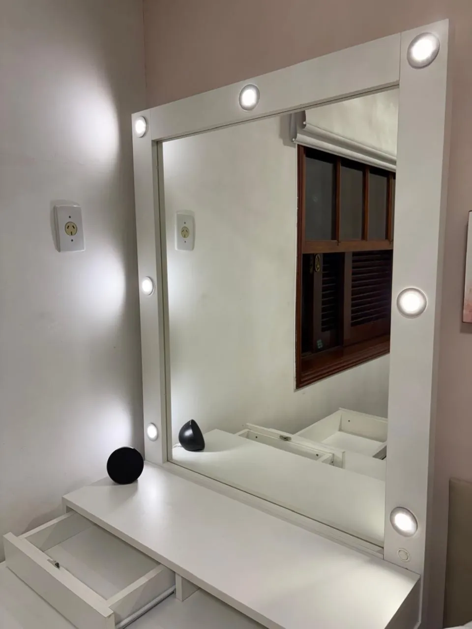 Linda penteadeira com design moderno e elegante, perfeita para organizar seus cosméticos e itens de beleza. Possui espelho com iluminação embutida, ideal para maquiagem. A bancada oferece espaço e gavetas para guardar seus pertences.