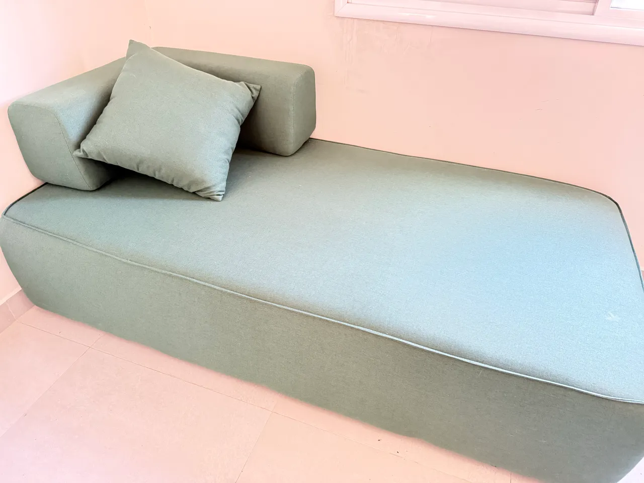 Sofá estilo divã na cor verde, com design moderno e minimalista, ideal para sala, escritório ou canto de leitura.