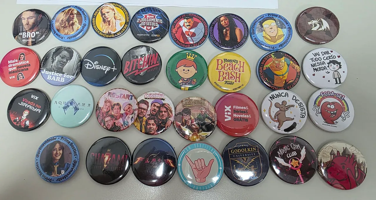 Botons diversos temas e de eventos como CCXP, D23, TUDUM