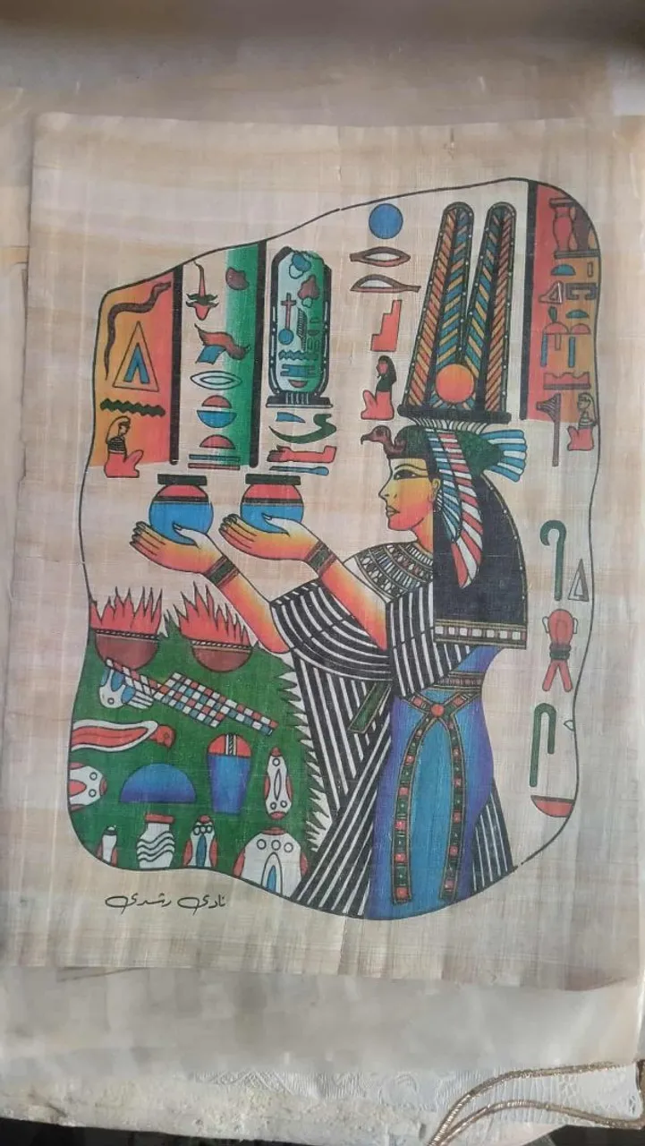 Maravilhoso papiro egípcio, uma obra de arte que transporta para o fascinante mundo do Egito Antigo. Detalhes vibrantes e cores ricas retratam cenas da cultura egípcia, tornando esta peça uma adição única e elegante para qualquer coleção.