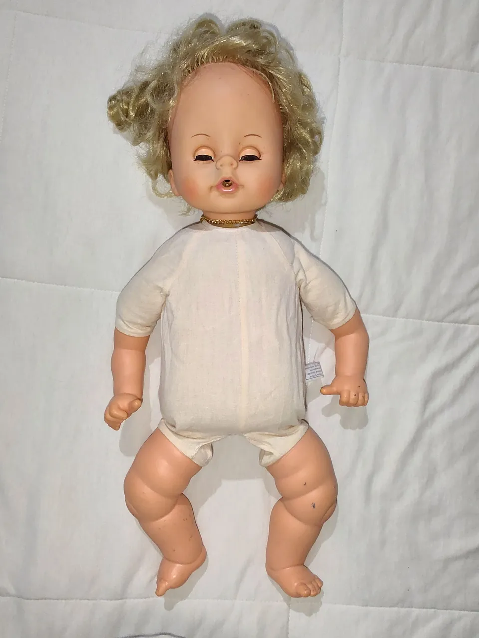 Boneca bochechinnha anos 80 da estrela,no estado, não tem mecanismo,o corpo tem partes costuradas como se vê nas fotos,a correntinha não tem o símbolo da estrela,tem manchinhas no rosto e braços.