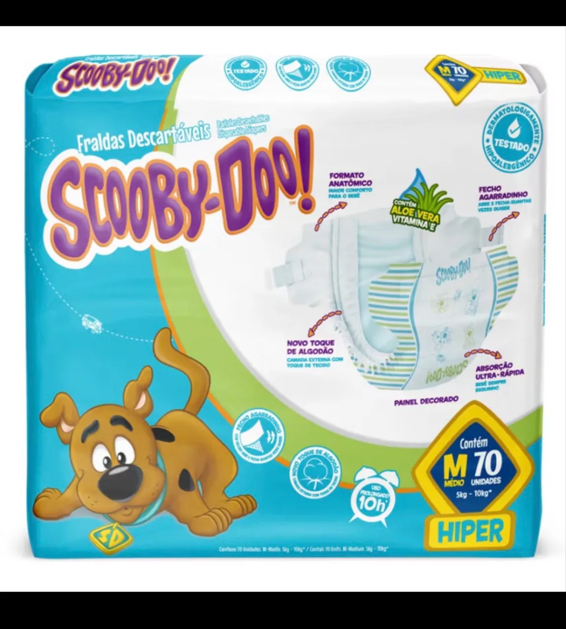As fraldas descartáveis Scooby-Doo! proporcionam conforto e proteção para o seu bebê. Com formato anatômico, toque de algodão e absorção ultra-rápida, garantem até 10 horas de uso prolongado. Hipoalergênicas e com Aloe Vera e Vitamina E, são ideais para a pele sensível do seu pequeno.