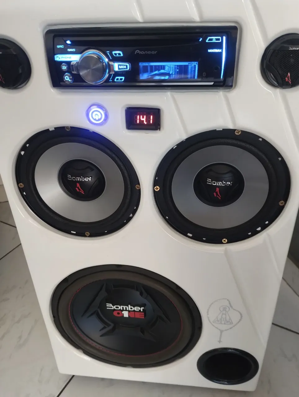 Grave muito bom, aparelho Pioneer golfinho mixtrax quem conhece sabe que é o melhor aparelho para regulagem, Sub Bomber 200wrms, kit duas vias 200wrms, modulo Taramps 400wrms casou muito bem com os falantes, fonte de 90A.