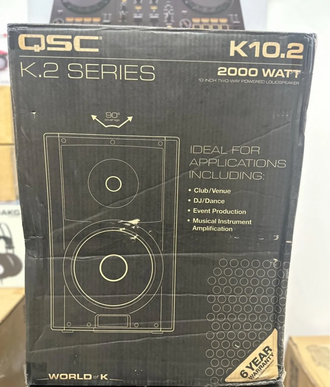 Caixa de som profissional QSC K10.2 com 2000W de potência. Ideal para clubes, eventos e DJs. Possui 10 polegadas de woofer e 90 graus de cobertura.