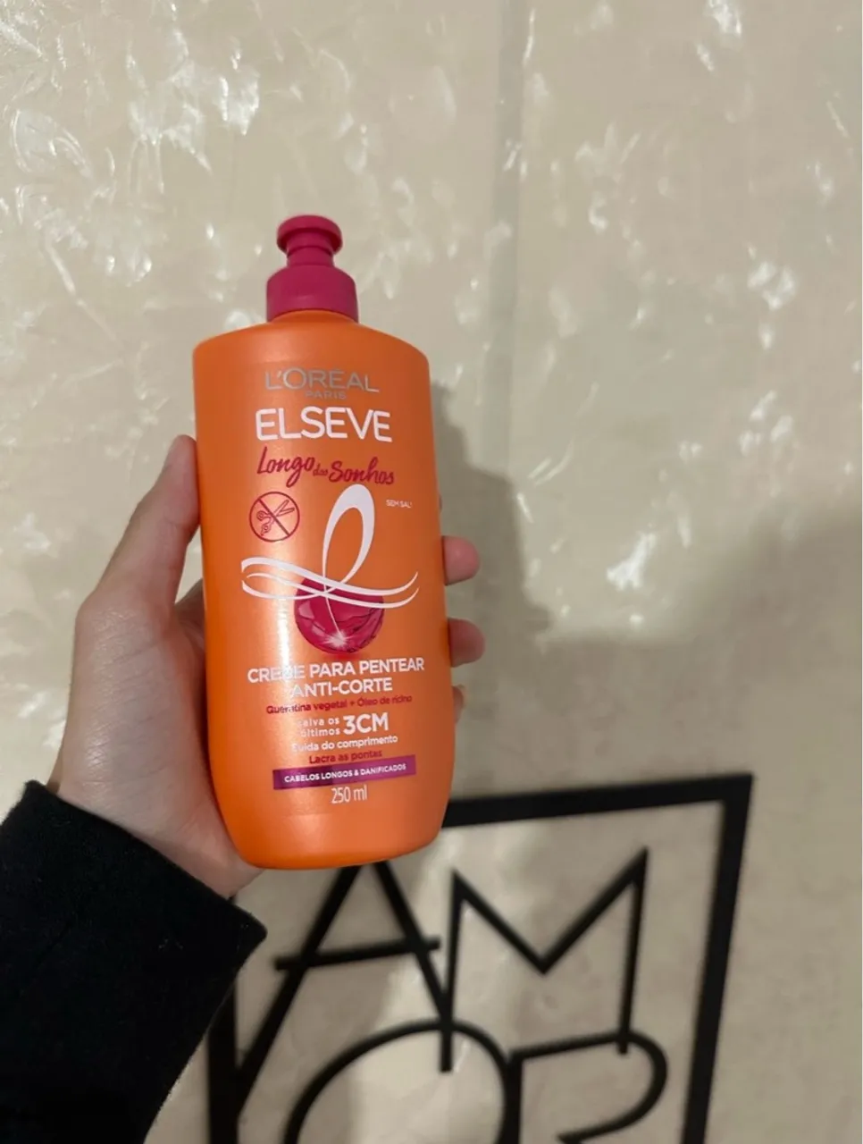 Frasco cheio, Elseve Longo dos Sonhos, com queratina vegetal e óleo de rícino, para cabelos longos e danificados. Sela as pontas e cuida do comprimento do cabelo.