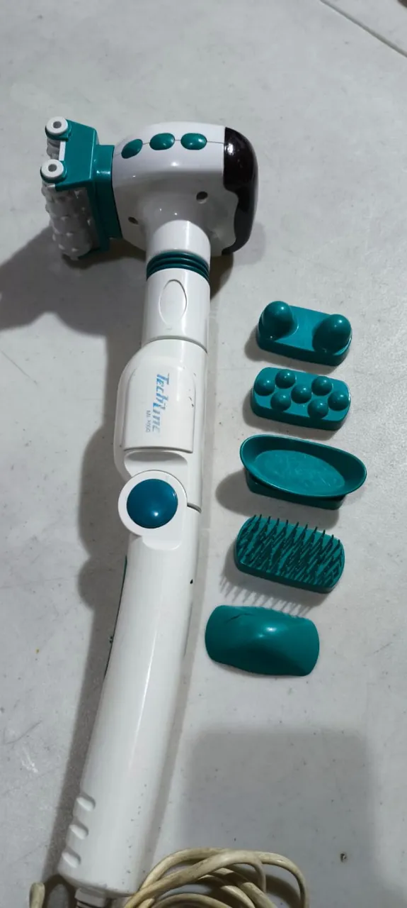 Massageador Techline com diversos acessórios para diferentes tipos de massagem. Alivia tensões e proporciona relaxamento.
