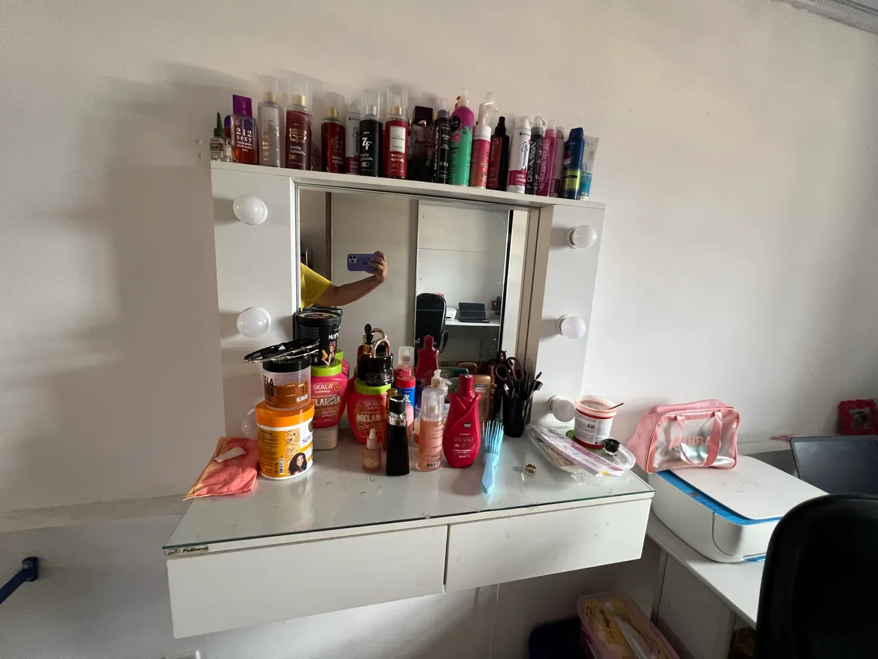 Linda penteadeira Semi Nova com espelho e luzes, perfeita para organizar seus cosméticos e criar um espaço de beleza! Ideal para quem busca praticidade e estilo.